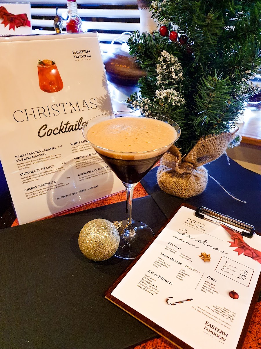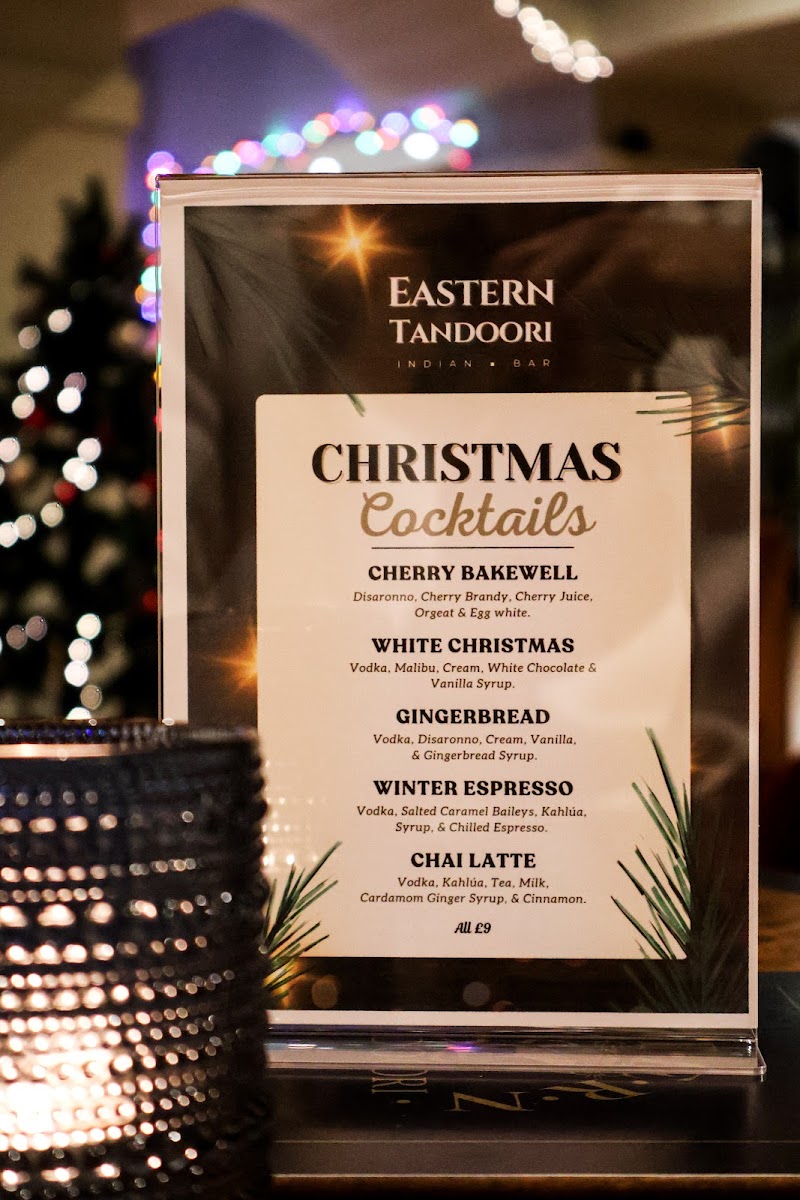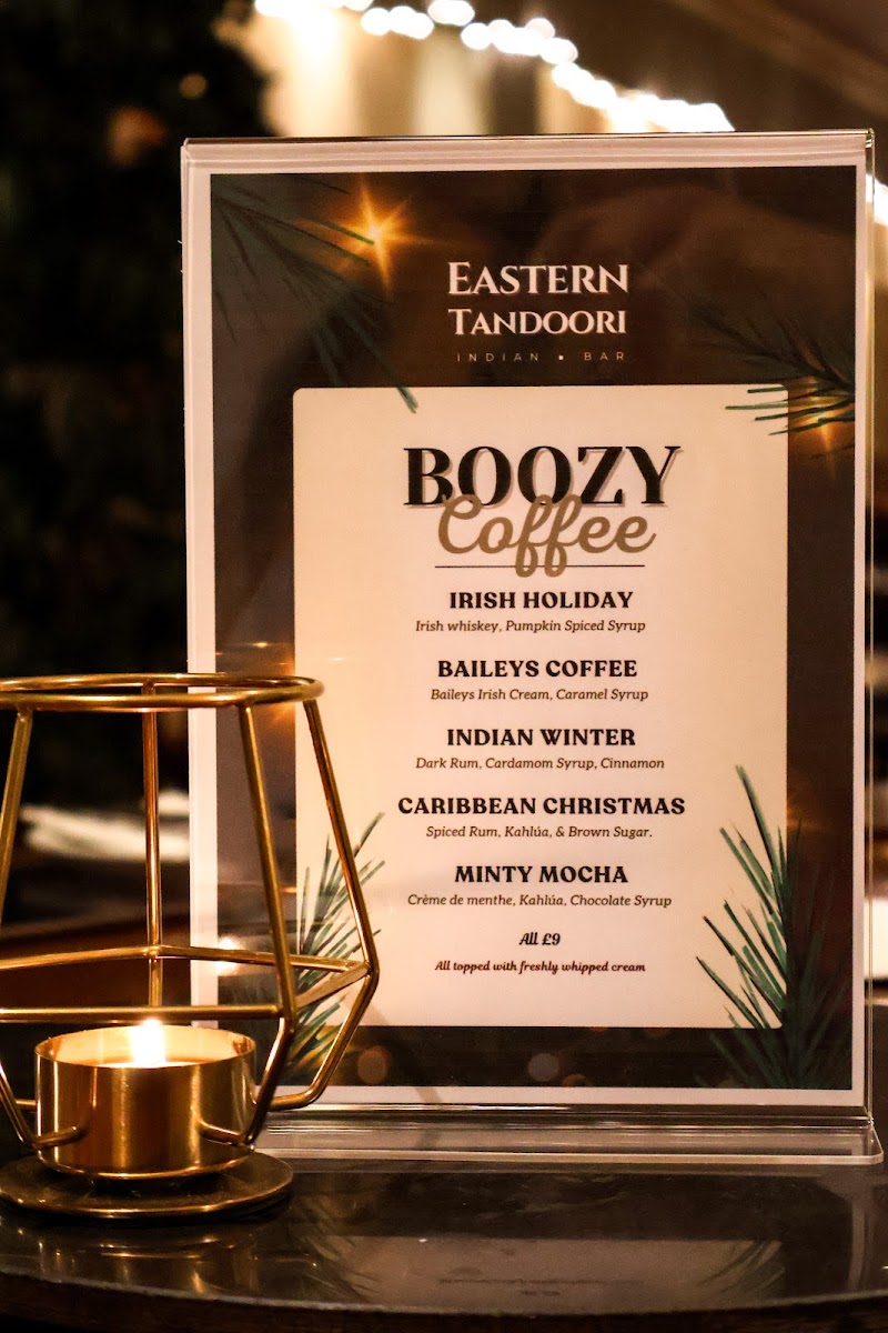 The menu at Eastern Tandoori Indian Restaurant & Takeaway offers a delightful mix of beverages, main courses, desserts, and seasonal specials, perfect for any occasion. Starting with their unique range of Boozy Coffees, guests can enjoy the warm flavors of Irish Holiday, Baileys Coffee, and Indian Winter Caribbean Christmas, or indulge in a refreshing Minty Mocha. The Christmas Cocktails selection is particularly festive, featuring drinks like Cherry Bakewell, White Christmas, and Gingerbread Winter Espresso, along with the cozy Chai Latte.